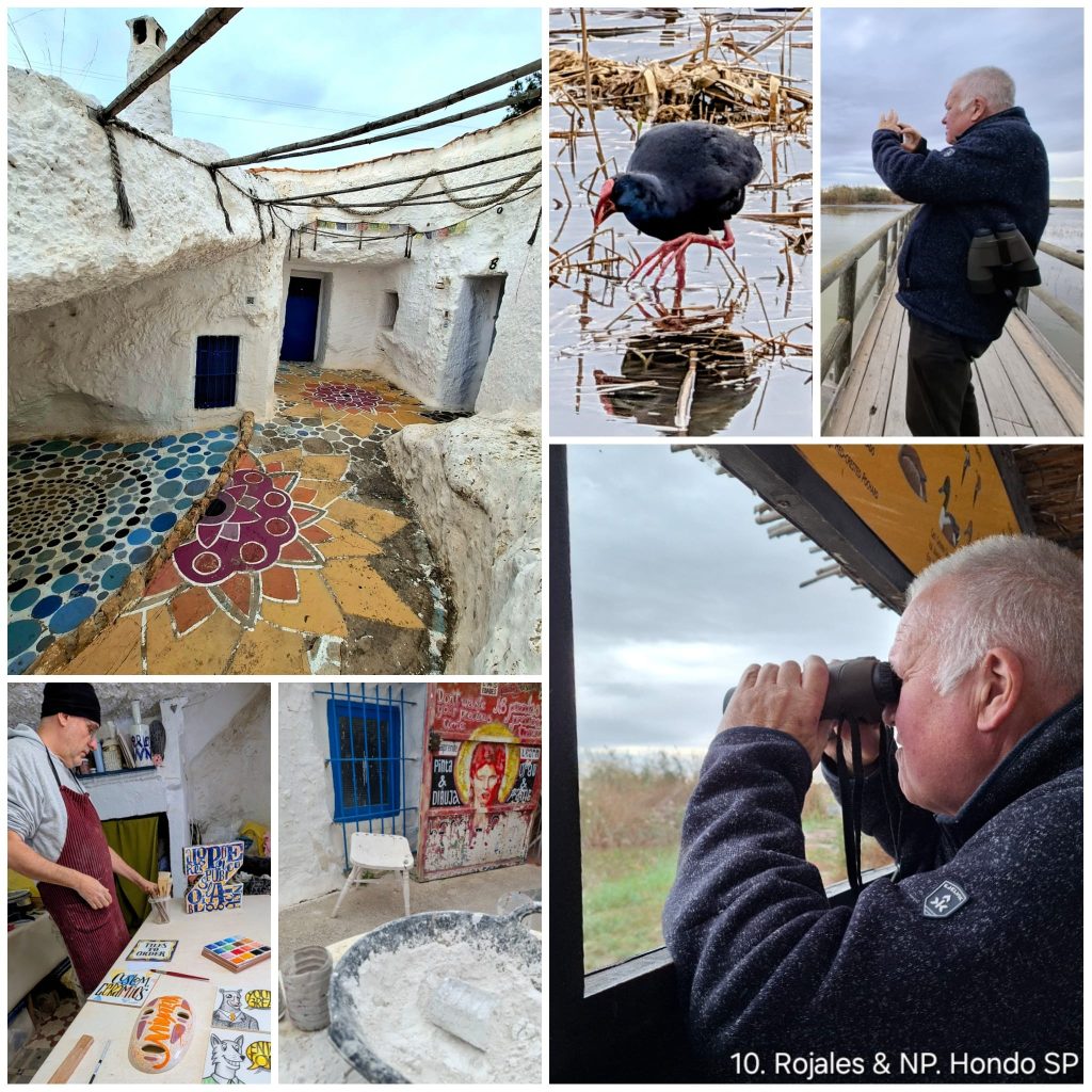 Na het bezoek aan de kunstenaars reden we verder richting het vogelpark op de zoutvlakten van El Hondo. De lunchpauze hielden we onderweg, waarna we het wandelpad over houten vlonders betraden. Al snel zagen we flamingo’s, al waren ze in dit seizoen opvallend wit gekleurd. Daarnaast lieten ook steltkluten en verschillende soorten koeten zich zien. Het absolute hoogtepunt was de purperkoet: groter en steviger gebouwd dan de meerkoet, met een knalrode snavel, rood-paarse poten en blauwpaars verenkleed. Een prachtige eerste waarneming.