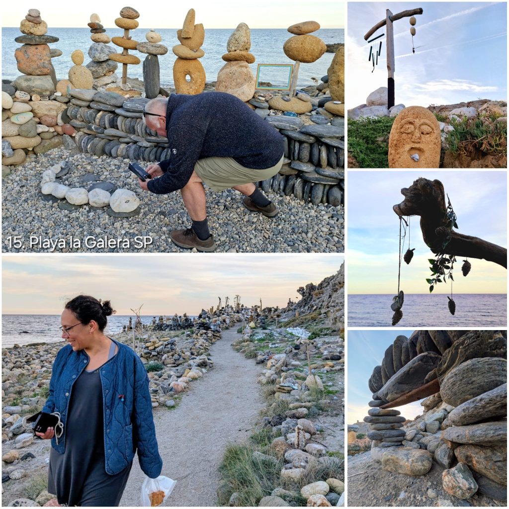 We maakten ook enkele uitstapjes in de omgeving. Zo bezochten we Playa La Galera, een bijzondere plek aan de kust die vooral bekendstaat als overnachtingsplaats voor campers. Het is geen klassiek zandstrand, maar een lange keienrand waar bezoekers spontaan een soort buitenmuseum hebben gecreëerd. Met gevonden stenen, hout en schelpen bouwen mensen kleine kunstwerkjes – van stapelstenen en sculpturen tot beschilderde keien met teksten in allerlei talen. Elke bezoeker laat iets achter. Het voelde als een collectieve expositie van reizigers uit de hele wereld.