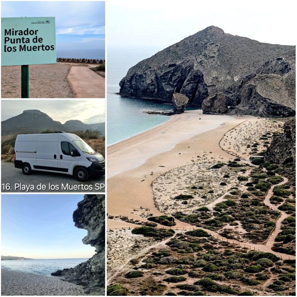 De dag begon grijs en bewolkt, een prima dag om de doden te bezoeken. Het uitzicht vanaf het uitkijkpunt boven het strand is indrukwekkend: een diepblauwe zee, een lange baai met licht grind en rotsen, en een opvallend rustige branding. Niet voor niets wordt dit strand regelmatig genoemd als een van de mooiste van Spanje.