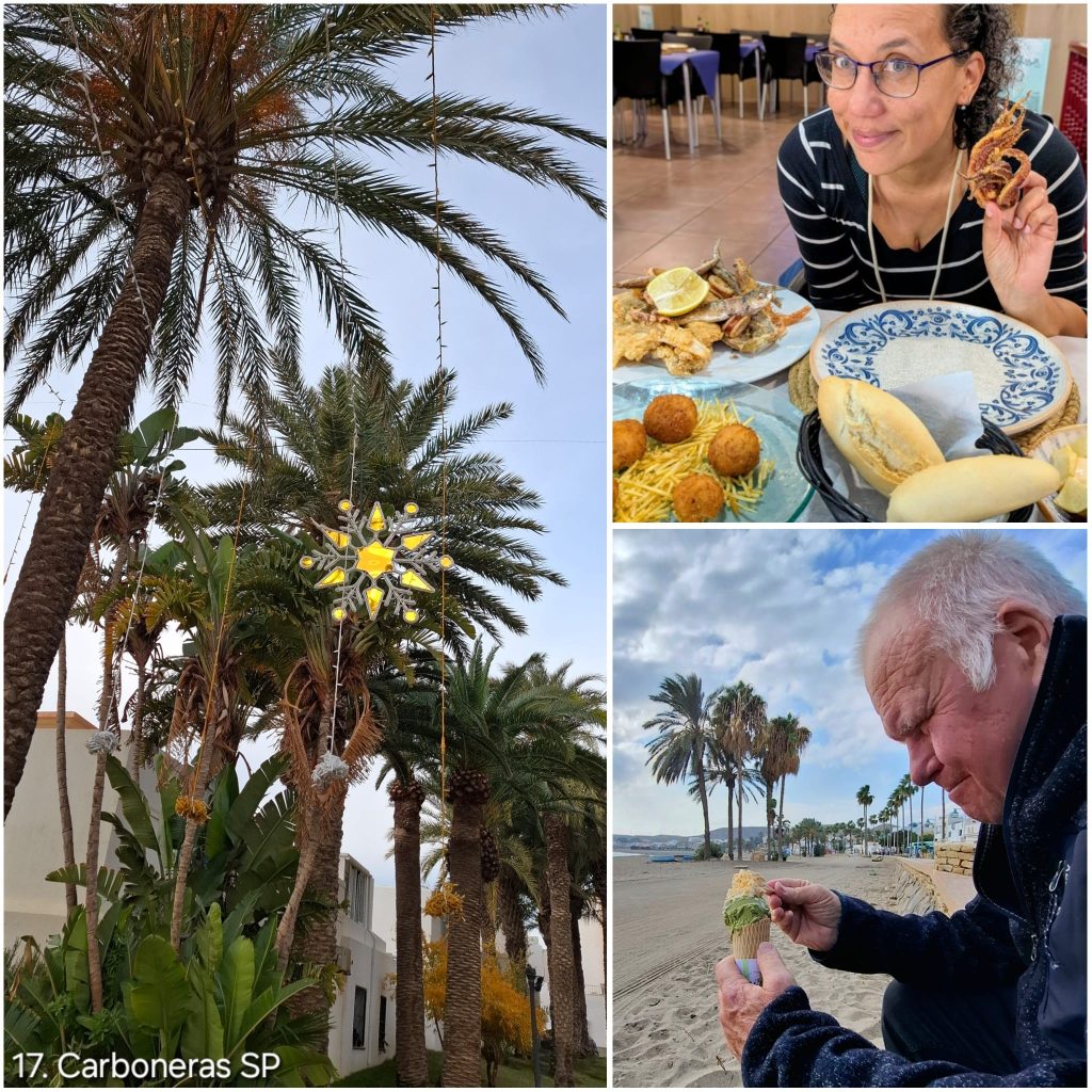 Carboneras, een typisch Spaans kustplaatsje met een boulevard, palmbomen en uitzicht op zee – alleen zonder toeristen, want het is laagseizoen. Het gaf het hele stadje iets slaperigs. We liepen over de promenade richting de markt, die vooral uit kledingkraampjes bleek te bestaan. Slechts een paar stalletjes boden groente en fruit aan, dus we waren er vrij snel doorheen.