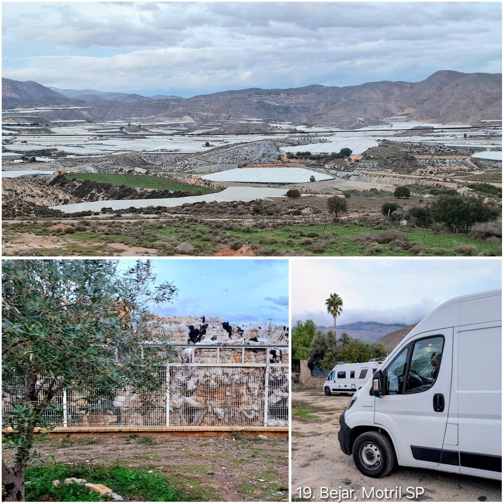 Terwijl we Cabo de Gata achter ons lieten en verder Andalusië in reden, veranderde het landschap abrupt. Op nog geen tien kilometer van de kust zagen we geen open natuur meer, maar een uitgestrekte zee van plastic. Vanaf de snelweg tot aan de kust stonden kilometerslange kassen waar groenten zoals tomaten en paprika’s worden verbouwd.