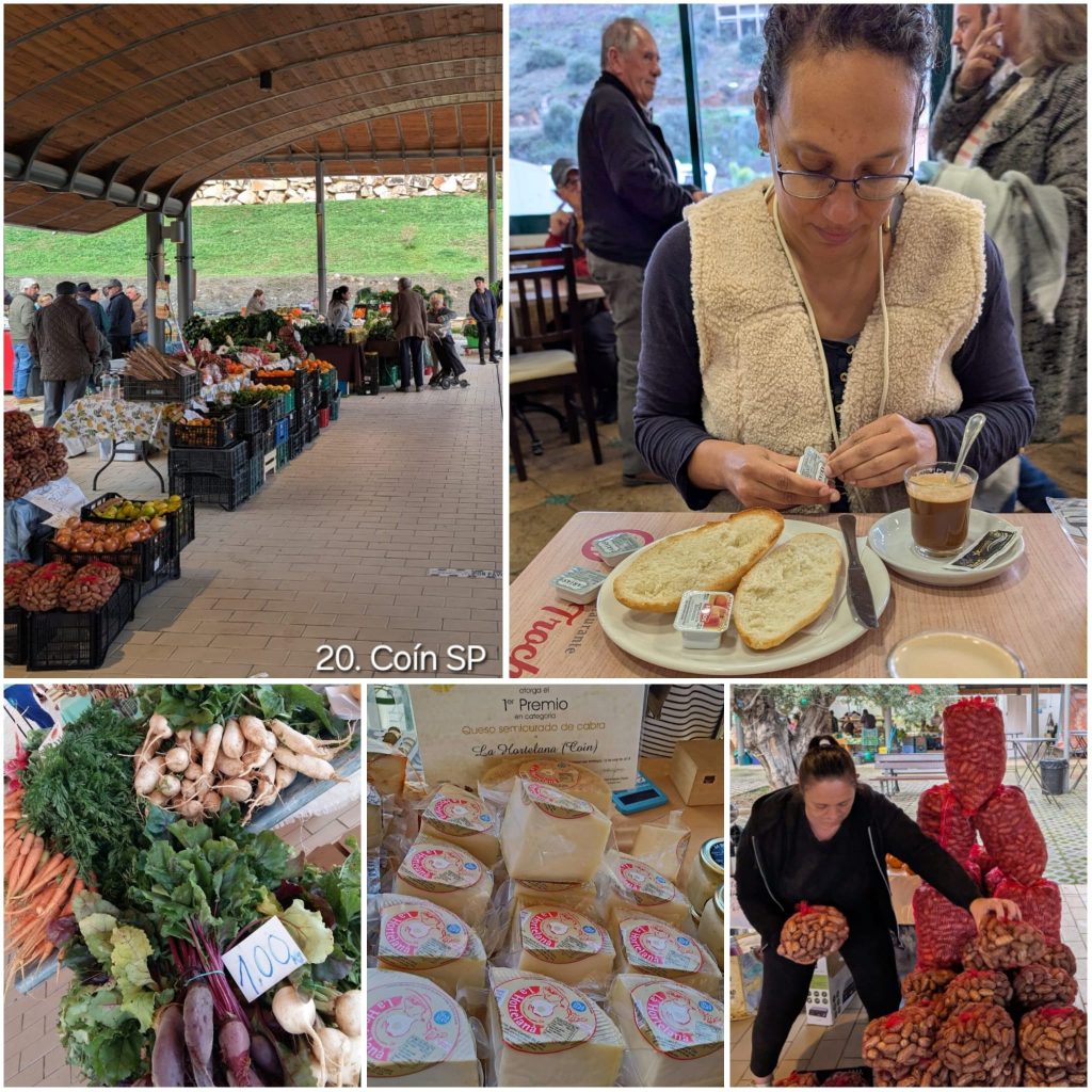 Het plan was om richting Marbella te rijden, maar al na zo’n tien kilometer zagen we donkere, dreigende wolken boven die kant hangen. In plaats van door te rijden, besloten we het spontaan anders aan te pakken en het eerstvolgende dorp te bezoeken: Coín. Dat bleek een goede keuze, want daar kwamen we terecht op een lokale eco-markt.