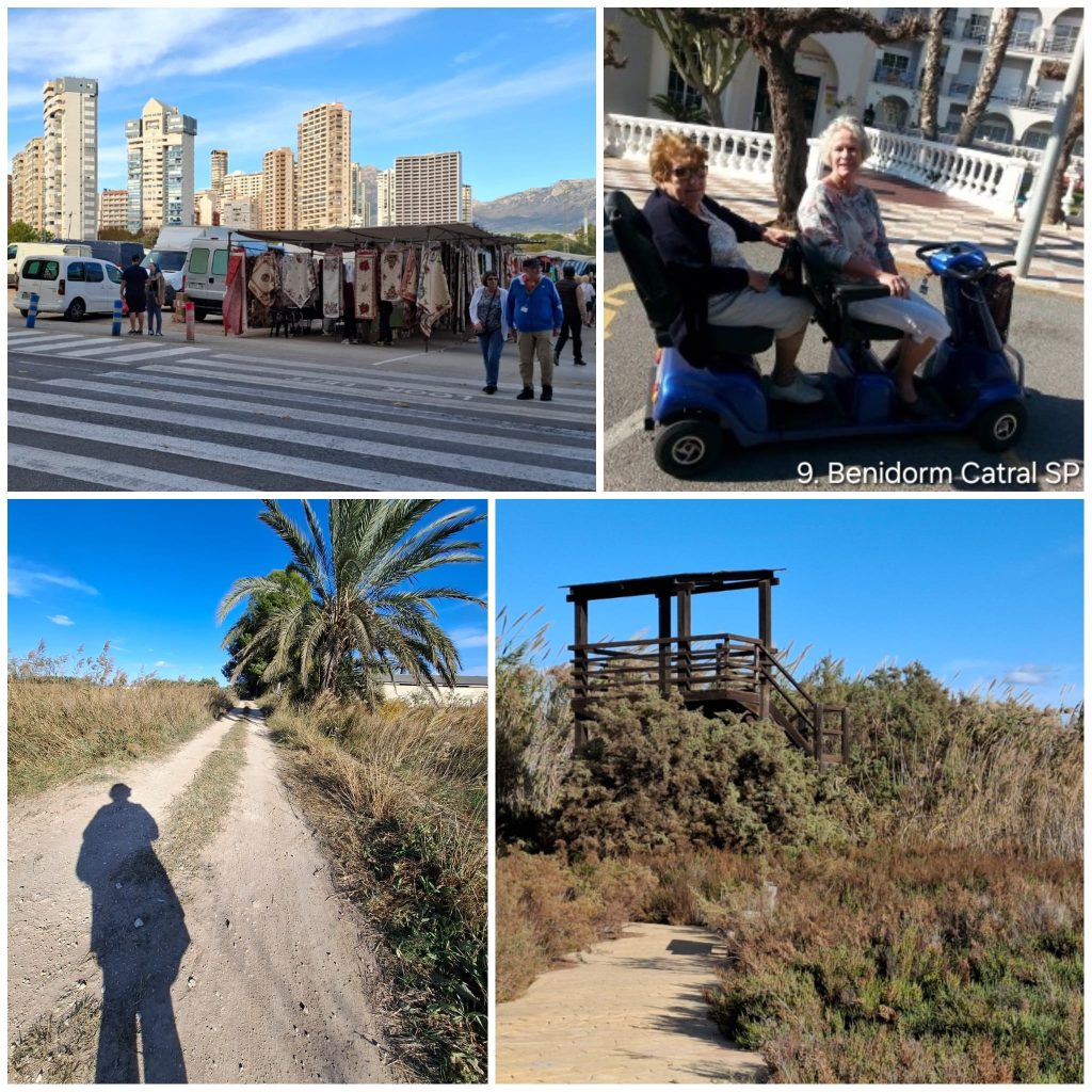 Na vertrek van onze bergcamping in Castel de la Guadalest voerde de route richting de kust bij Benidorm. De wekelijkse markt bleek minder geschikt voor verse groenten en fruit dan gehoopt; het aanbod bestond vooral uit kleding, ondergoed en parfum. Daardoor ontstond een perfect excuus voor een laat Spaans ontbijt. In een klein koffietentje genoten we van café con leche en tostada con tomate, terwijl vanaf het terras een kleurrijke stoet scootmobielen en Engelse bezoekers voorbijtrok. De mix van zomerjurkjes en dikke winterkleding zorgde voor een bijna komisch straatbeeld.