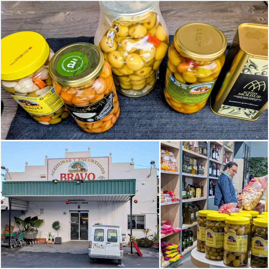 Er zijn verschillende soorten olijven, waaronder jonge en oudere olijven. Die oudere zijn langer ingelegd, minder groen en minder bitter. We zijn daar behoorlijk goed geslaagd en kozen meerdere soorten. De grootste pot in het midden — gevuld met enorme Manzanilla-olijven, bijna zo groot als pruimen — was Bob zijn kerstcadeau. Die had hij heel bewust uitgezocht: de grootste olijven die ze hadden.