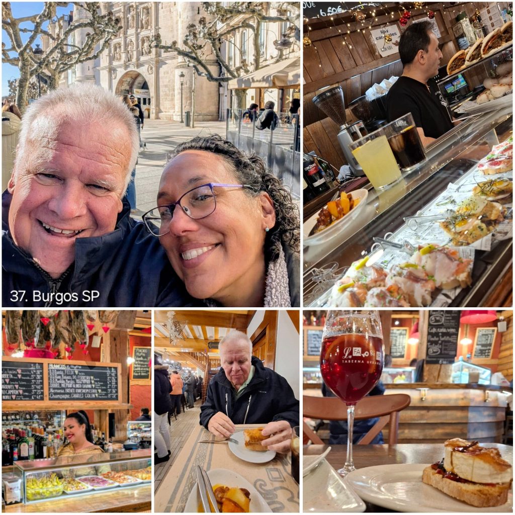 De laatste dag van het jaar hebben we gereserveerd voor een tour de Tapas. Een soort kroegentocht langs de vele tapas bars in Burgos. In ieder cafe proberen we weer te achterhalen wat hun specialiteit is. Een drankje een hapje wat kletsen en weer door naar de volgende kroeg. Spanje op zijn best, drukke cafés waar je niet uitgekeken raakt. Dames in bontjassen, mannen met petten op en het geheel omlijst met kinderwagens en groepjes studenten. Onze tapas bestaan uit morcilla balls, croquettas de Iberico, pulpo con papas, queso de cabre, taco de pollo en bacalao de fritas. Het geheel is omlijst met Tinto de verano en Sangia.