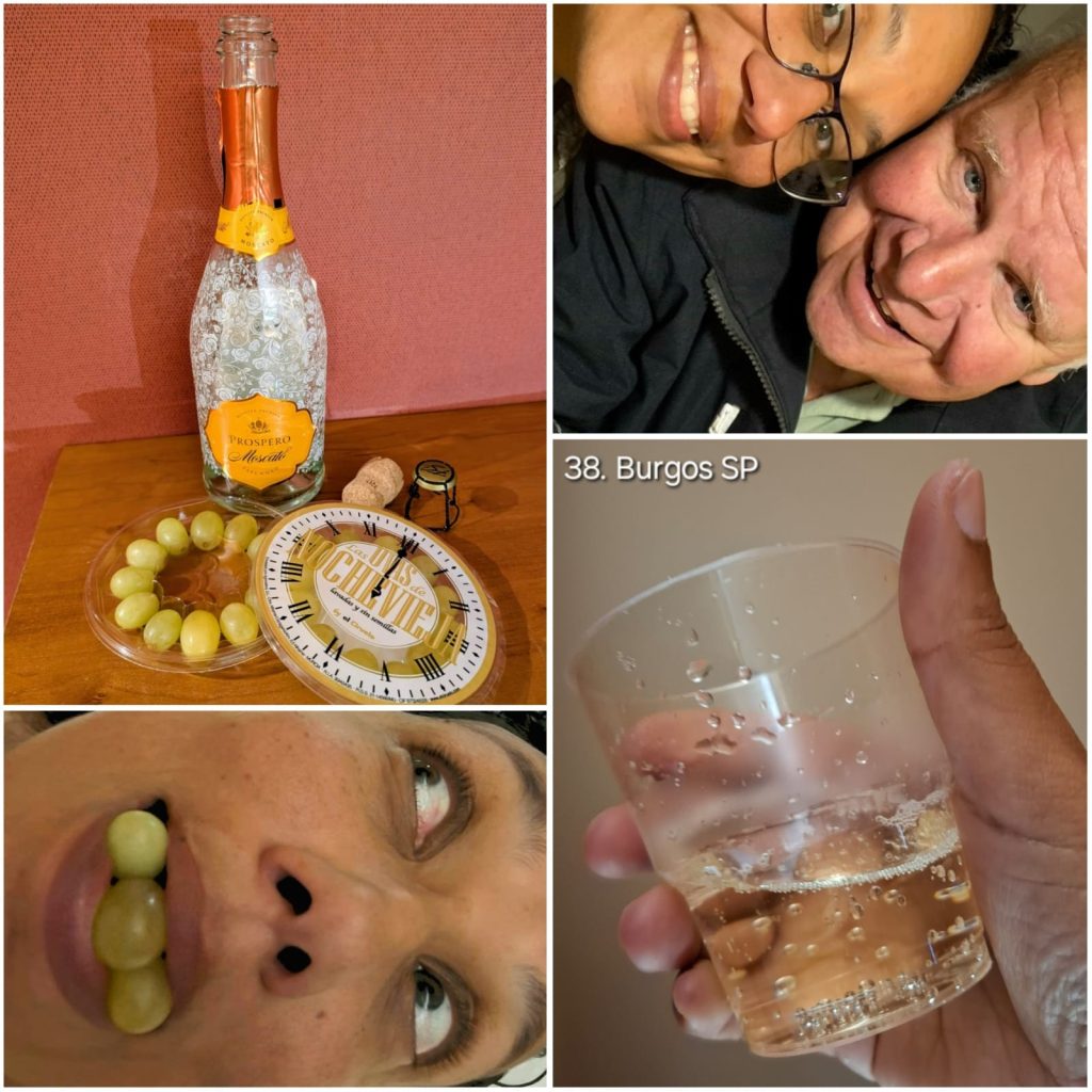 De jaarwisseling op onze hotelkamer verliep volgens Spaanse traditie: een Spaanse bubbelwijn, Spaanse tv aan met aftelklok en 12 druiven per persoon.