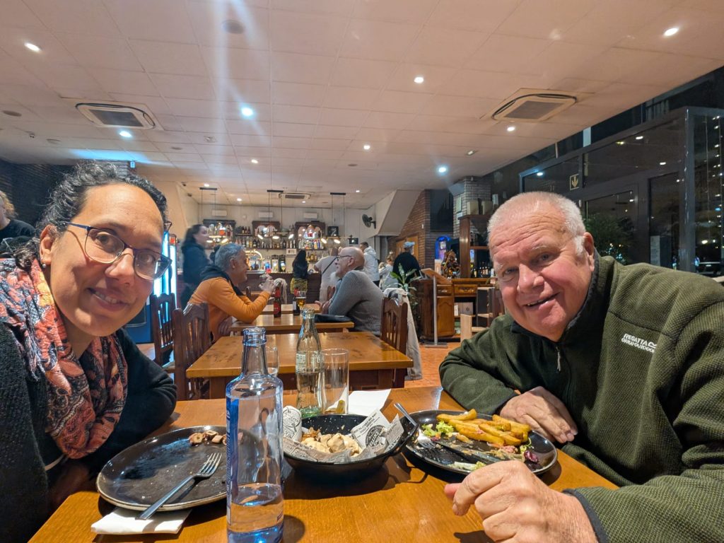 ’s Avonds hebben we voor het eerst deze reis in Spanje buiten de camper gegeten, in een lokaal etablissement dat het midden hield tussen een eenvoudige restaurantkantine en een wijkvoorziening. Het was een levendige omgeving, met veel drukte, kinderen en boven ons vermoedelijk een dansschool. De maaltijd was eenvoudig maar goed. Ik nam een hamburger met patatas bravas, die op open vuur werd bereid, wat de smaak ten goede kwam. Natuurlijk sloten we af met een café con leche.