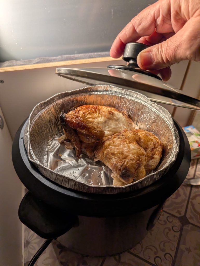 - de kip uit de warmhoudcontainer, (de halve kip kochten we van het spit op de markt)