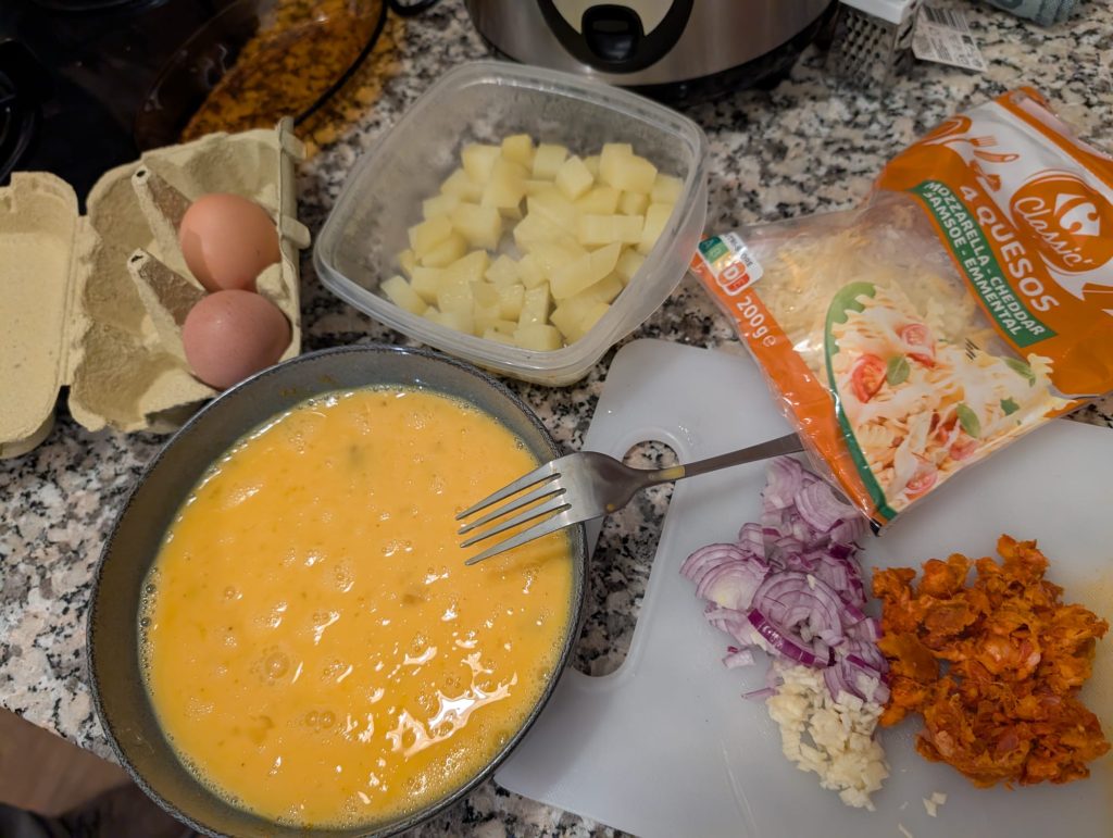 - Meng de aardappeltjes, ui, knoflook en chorizo door het losgeklopte ei.