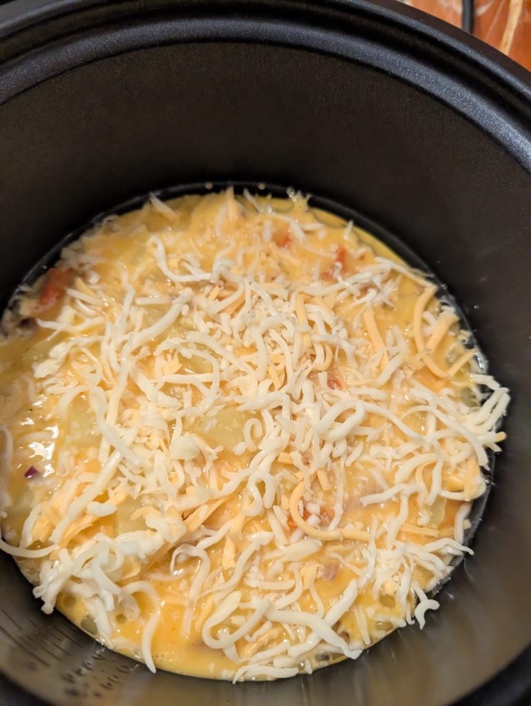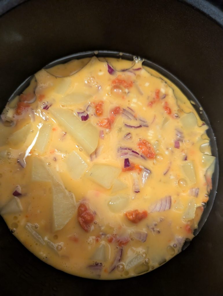 - Giet het eiermengsel met de groenten in de rijstkoker.