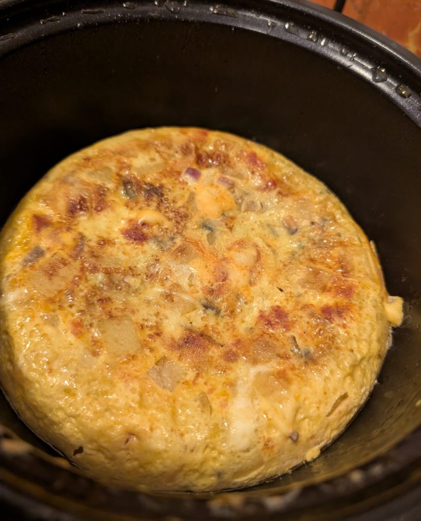- Laat de tortilla nog even doorgaren tot hij volledig gestold en licht goudbruin is.