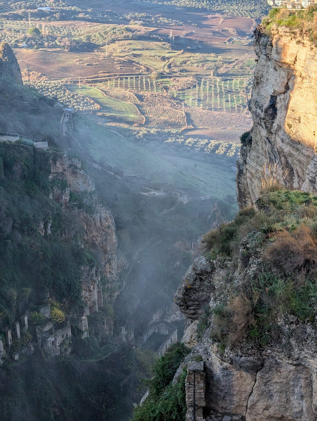 "description": "Deze foto toont de Puente Nuevo in Ronda, \u00e9\u00e9n van de meest iconische bruggen van Andalusi\u00eb. De brug overspant de diepe El Tajo-kloof, een spectaculaire ravijn die de oude en nieuwe stad van Ronda van elkaar scheidt. Met een hoogte van ongeveer 98 meter boven de rivier is dit niet alleen een indrukwekkend bouwwerk, maar ook \u00e9\u00e9n van de bekendste uitzichtpunten van Zuid-Spanje.\r\n\r\nWat opvalt op de foto is de massieve stenen constructie met de grote centrale boog en daarboven de kleinere openingen. In het midden van de brug bevindt zich zelfs een kamer, die in het verleden onder andere als gevangenis is gebruikt. De gebouwen bovenop de kloof laten goed zien hoe de stad letterlijk op de rand van de afgrond is gebouwd."