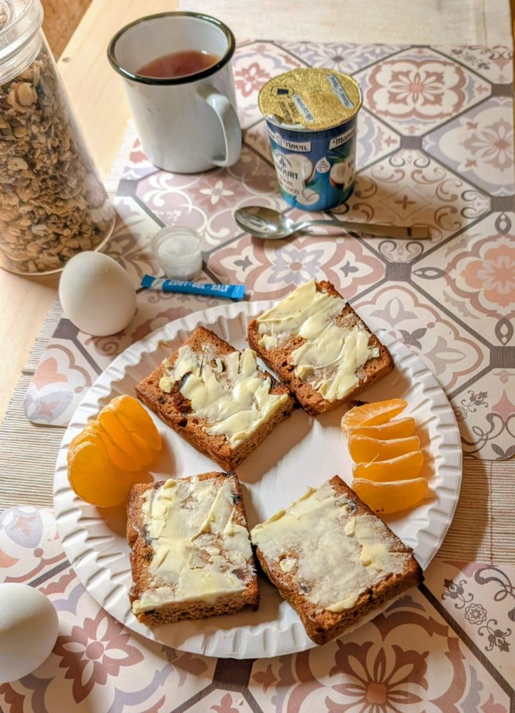 In de bus kunnen we ons bed opklappen tot een eettafel, waardoor we gemakkelijk een simpel ontbijtje kunnen klaar maken en opeten.