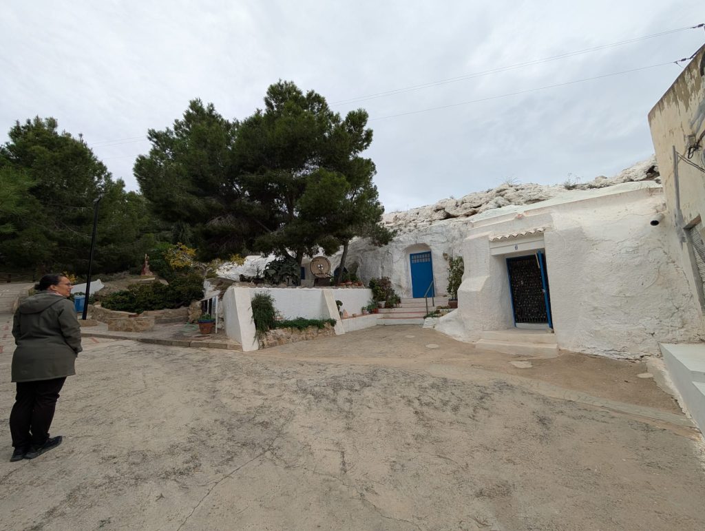 In Rojales kwamen we terecht bij het bijzondere Casa del Contjes, een eigenzinnige plek waar schelpen de gevels sieren en het geheel iets bijna sprookjesachtigs krijgt. De speels “kontjes” genoemde schelpen vormen kunstobjecten die je vooral níét mag aanraken, maar die perfect passen bij de creatieve energie van het dorp. Rondom het huis ontdekten we grotwoningen die zijn omgevormd tot ateliers. In deze kunstenaarscaves wordt gewerkt aan keramiek, zilver en gipskunst, en één kunstenaar voelde voor Bob als een echte zielsverwant doordat hij eveneens met gipsvormen werkt. Tijdens ons bezoek gaf hij een workshop aan een schoolklas, waarbij kinderen kleine figuurtjes maakten met malletjes, ze droogden op een kachel en daarna met veel plezier beschilderden. Het was een mooi voorbeeld van hoe kunst hier op een natuurlijke manier wordt doorgegeven aan de volgende generatie.